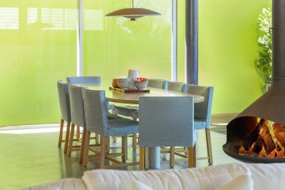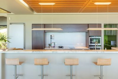 • Expansive open-plan living crowned by a unique suspended French fireplace, heated polished concrete floors, and slotted cherry veneer ply ceilings for acoustic excellence