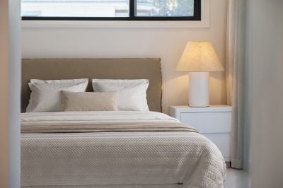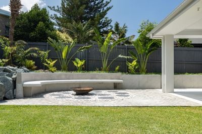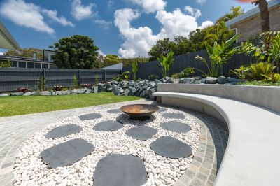 The ground level offers expansive open-plan living, dining, and kitchen spaces that seamlessly connect to landscaped gardens, complete with a fire pit – perfect for entertaining or relaxing outdoors. A spacious guest bedroom with ensuite, a separate laundry, and ample storage complete this level.