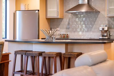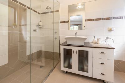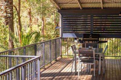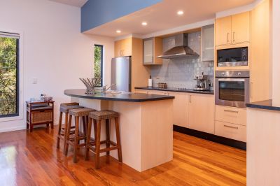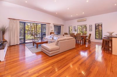 The heart of the home is a spacious open-plan living, dining and kitchen area, where soaring ceilings, warm timber flooring, and abundant natural light create an inviting atmosphere. The well-appointed kitchen features ample bench space and storage, seamlessly connecting to the living zone and flowing outdoors to a large undercover entertaining deck-perfect for alfresco dining, hosting family and friends, or simply unwinding while enjoying the surrounding birdlife and leafy outlook.